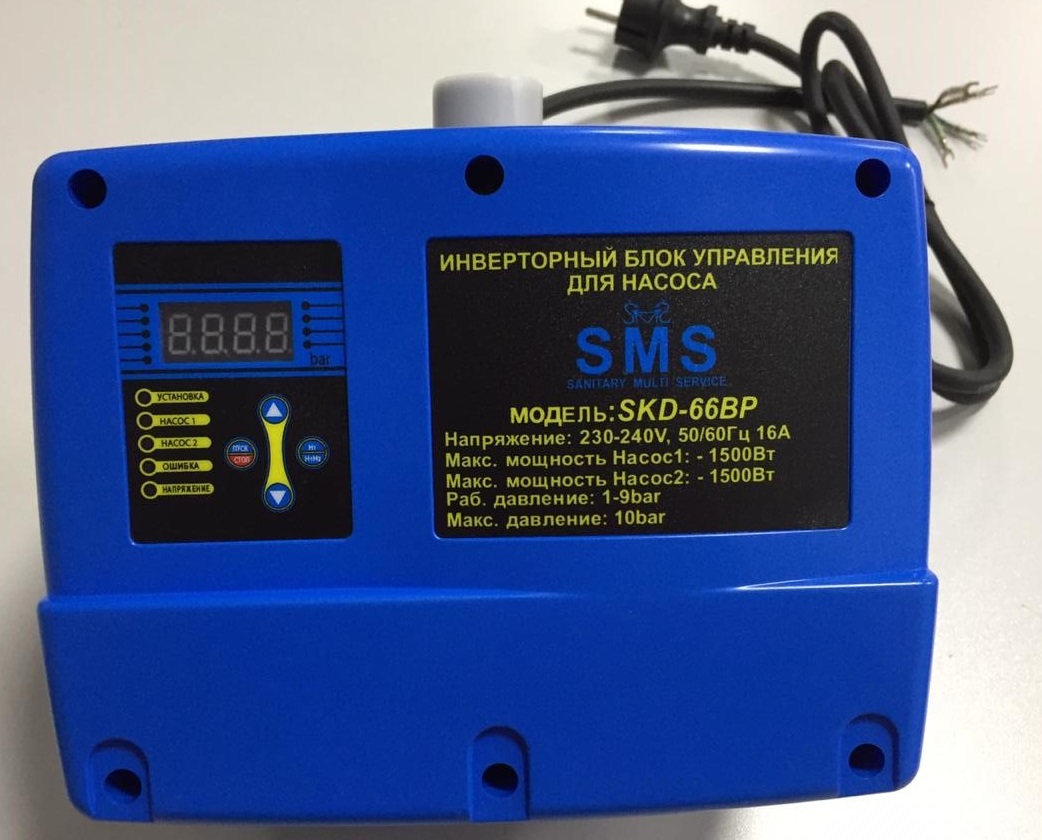 Инверторный блок управления предназначен для автоматического управления насосами с мощностью электродвигателя до 1,5 кВт. Устройство автоматически поддерживает заданное давление в системе водоснабжения путем частотного регулирования привода насоса.