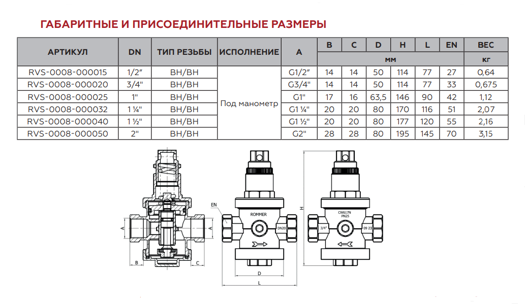 Редуктор давления воды 1-1/4"ВР, ROMMER с отверстием под аксиальный манометр 1/4"ВР (регулировка 1-6 бар, макс. входное давление 25 бар.) T= от 0 до +100*С
