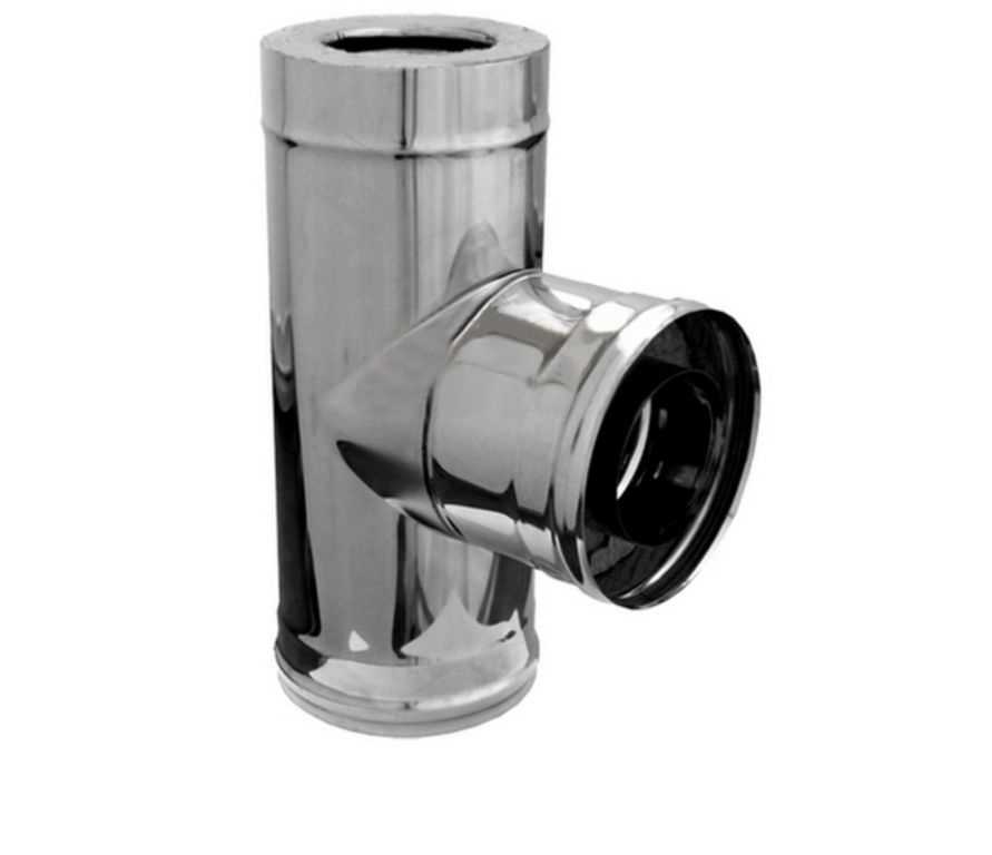 Утепленный сэндвич тройник для дымохода изготовленный из нержавейки толщиной 0.5 или 0.8мм, наружная часть выполнена из нержавеющей или оцинкованной стали. Предназначено для изменения направления дымового канала на угол 45 или 90 градусов.
