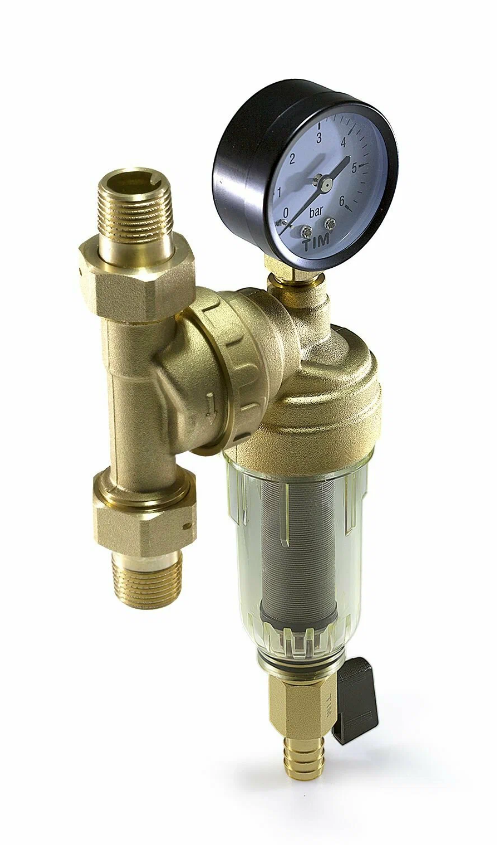 Фильтр самопромывной с манометром 1/2"НР свободного вращения (прозрачный, холодная вода) макс. 16бар, +40гр., Kvs макс. 1,3м3/час., сетка нерж. сталь 100мкм. + 1 запасная.