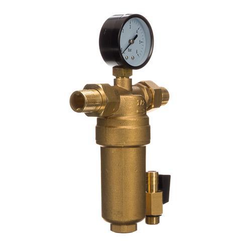 Фильтр самопромывной с манометром 1/2"НР ГВ (латунь) макс. 10бар, +70гр., 2,5м3/час., сетка нерж. сталь 100мкм. + 1 запасная.