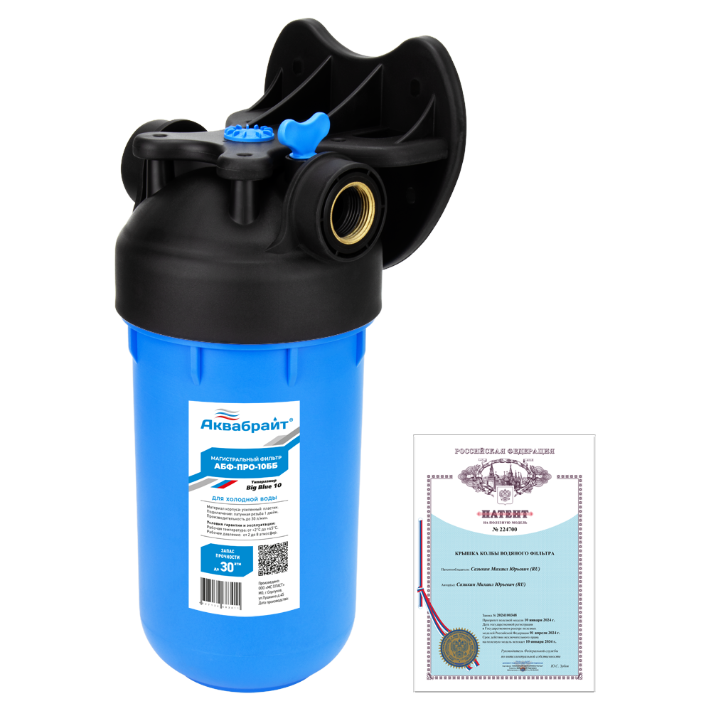 Фильтр магистральный 10" Вig Вlue (синий) "АКВАБРАЙТ" 1" ВР (латунь) с пласт. кронштейном и календарем. Фильт предназначен для ХОЛОДНОЙ воды.