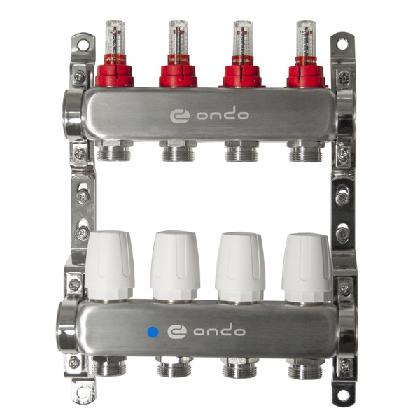 Коллекторная группа для теплых полов, 1"х3/4"ЕК, 4 выхода, нержавеющая сталь с расходомерами и термостатическими вентилями. ONDO