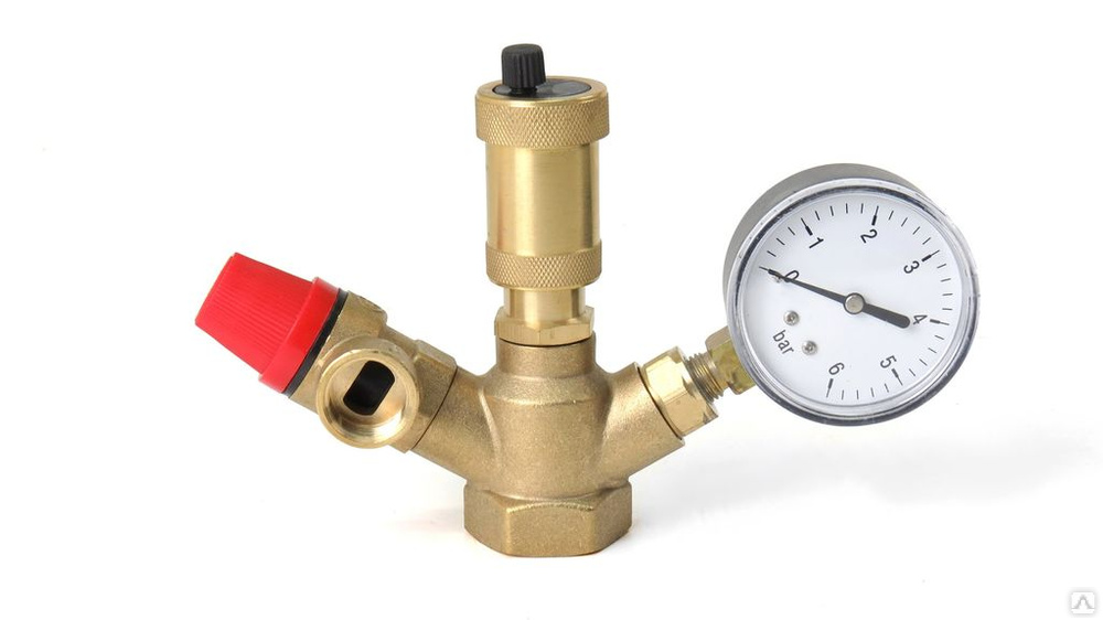 Группа безопасности котла, 1"ВР латунь, (мини) клапан предохранительный 3бар, манометр, воздухоотводчик.
